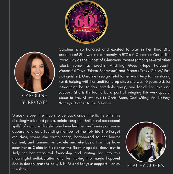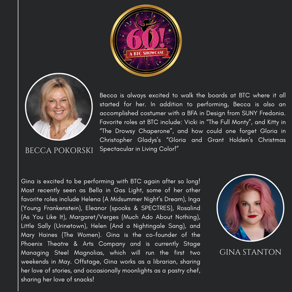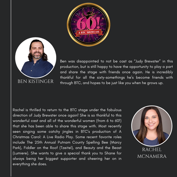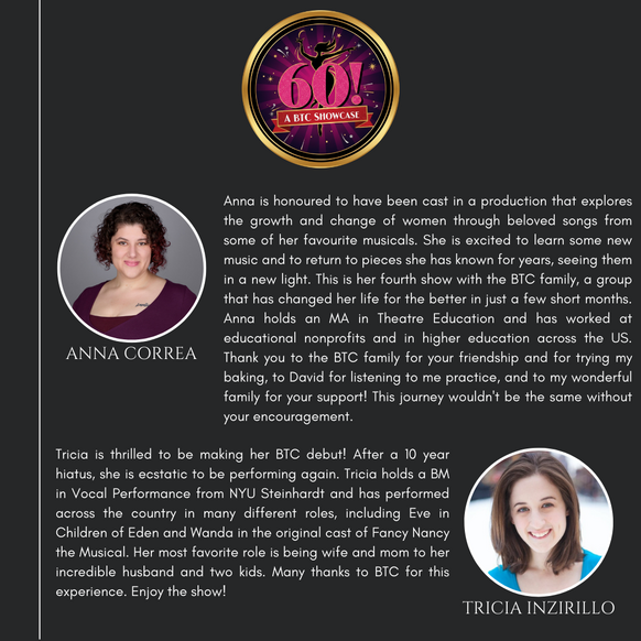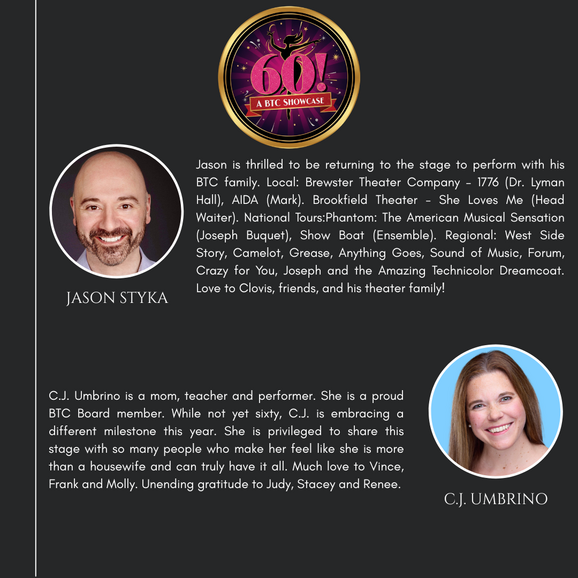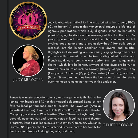 The Brewster Theater Company is pleased to present its first BTC Showcase, "60!" The show highlights the journey of a woman turning 60 who considers her life's choices through Broadway songs sung by younger versions of herself. It is a funny, poignant, and spicy look into how women evolve and grow before, during, and after menopause! Come and enjoy the vocal stylings of some of your favorite BTC musical theater performers!